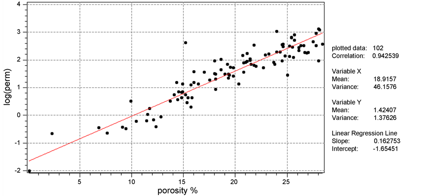 Another way to estimate overall permeability is to use the linear relationship to estimate permeability at the all sample point of porosity. According to the definition, the equation is