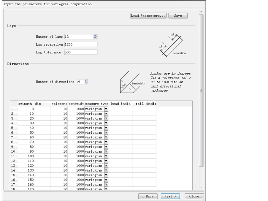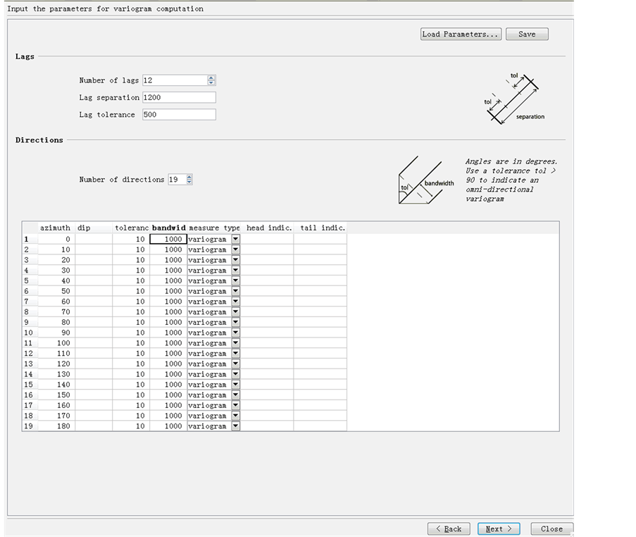 To make sure the pair of data is sufficient in a variogram, lag numbers, tolerance and lag separation should be carefully selected. At the beginning, the course example of thickness variograms for flow unit 5 is followed. Figure 5 shows the software set for variogram of thickness. As discussed in the class, for the number of Lags, 12 - 20 will be fine, so 12 is used. Lag Separation is the point separation in the variogram profile/graph, which is discussed as lag distance in textbook and it is half of the maximum possible distance within a region of interest, based on the rule of thumb. 1200 ft is used in this case. Tolerance respect to distance as well as direction of 10% - 50% of the separation will be fine, but mainly depends on data set. Thus, 500 ft is used for tolerance of distance and 10˚ is used for tolerance of direction. To check whether the anisotropy effect exists, we check every ten degree azimuth angle in 180˚, as based on the assumption of symmetric, the variogram will provide the same estimate by adding 180˚ to the given direction.