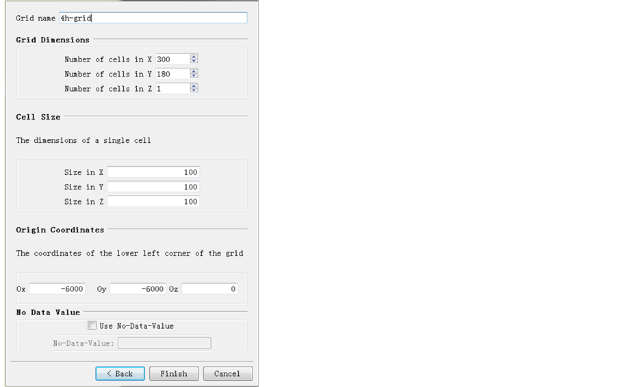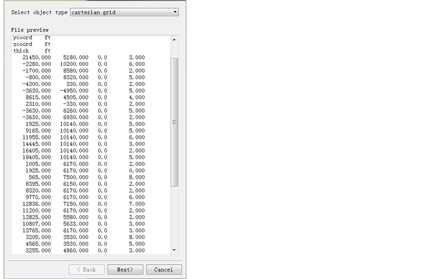 After the variograms are modeled, the next step is to build up the grid estimation map based on the sample data. The aim of Kriging estimation is to utilize the models before to estimate values at unsampled locations with minimized variance condition. First, the data is loaded with grids divided. Figure 9 shows part of the original thickness data and the software set for the grid system built for them.