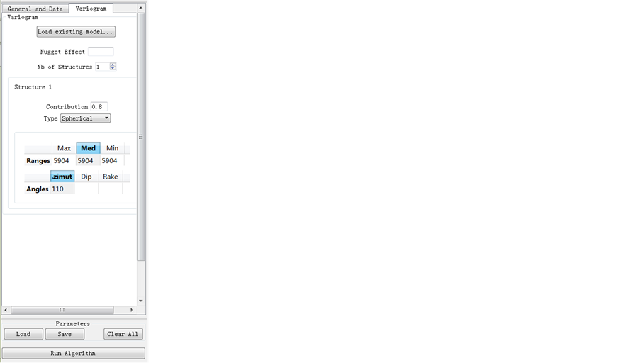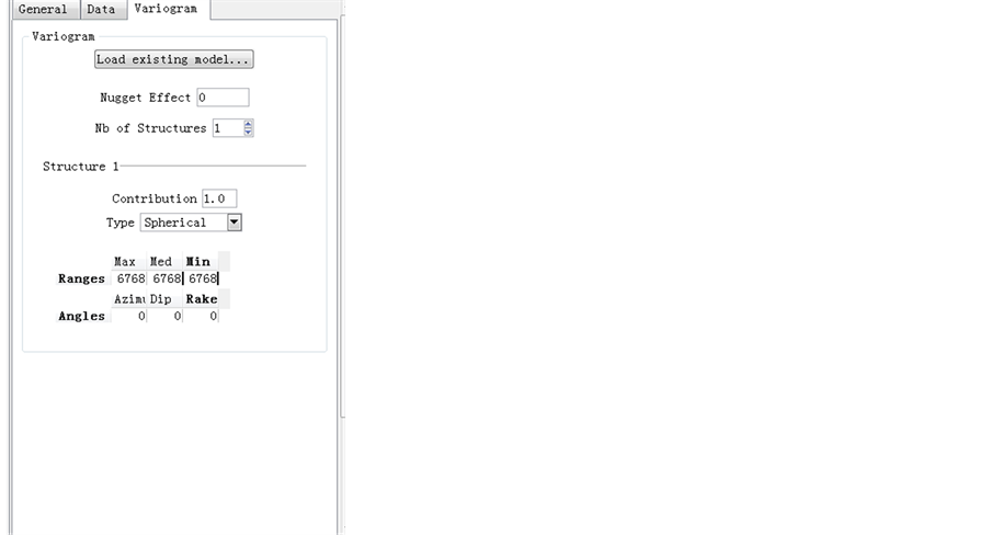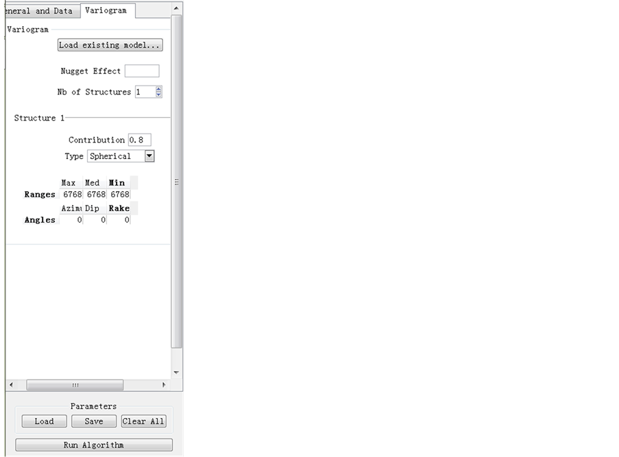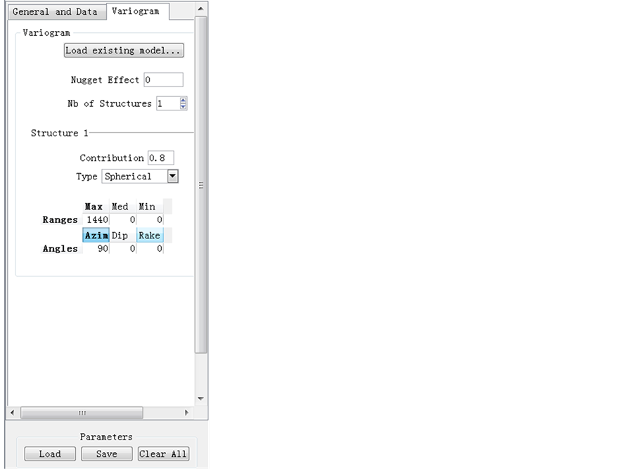 The “variogram” tab is filled with the information on the variogram modeling of thickness which is developed before. Both range and direction of minimum continuity and maximum continuity are tried at first. The “raw” sill is set at 0.8 instead of 1.0 is to show that the raw data is applied for Kriging estimation and the structure of variogram is not exactly matched for the raw data. However, this makes no difference of 0.8 - 1.0 after carefully checking, excepting that the magnitude of the estimated Kriging variance at each grid is changed.