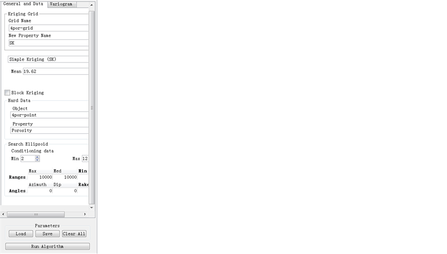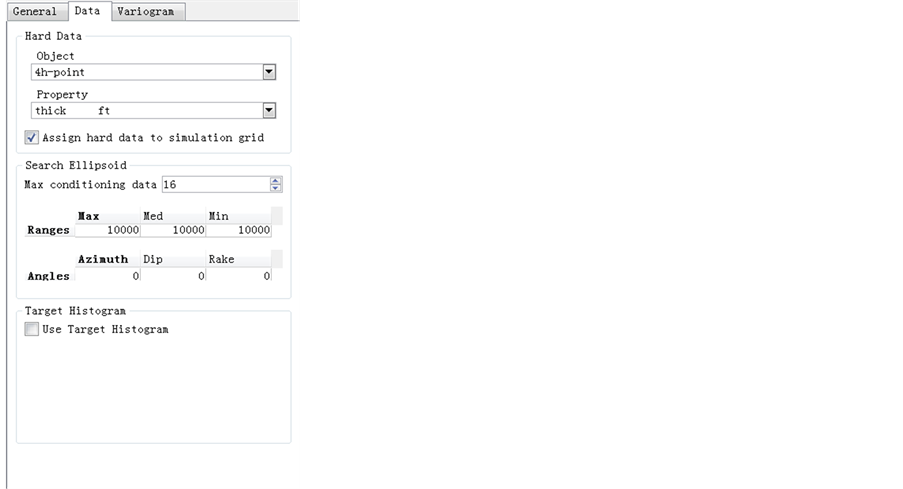 values in the “4 h-point” point set data. The size of the searching neighborhood is determined by the maximum range of the variograms, which could be recalled in the previous section. The searching neighborhood is set in “search ellipsoid” with searching radius of 10,000 ft, requiring a minimum of 2 data points to be found within 10,000 ft of each grid point and using no more than 12 nearest neighboring points in the estimation for each grid point.