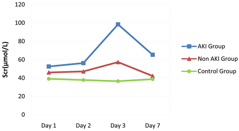 In the AKI group, there is no significant change in Scr in first and second day and then increases with increasing age and again decreases by seventh day. In case of Non-AKI group, each time the reading is slightly higher than those in the control group, the first decline is seen in seventh days. In the control group, from day 1 to day 7, Scr is basically unchanged.