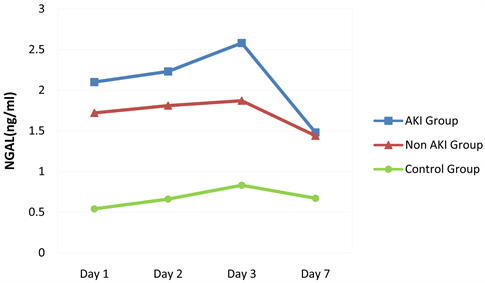 Table 3 and Figure 2 show that NGAL is significantly high in AKI group and Non-AKI group when compared to control group of the preterm child of same age. This difference is statistically significant. AKI group and non-AKI group, on days 1 to 3, P < 0.05 difference was statistically significant. AKI group and the normal control group, at day 1, 2, 3, 7 days, P < 0.05 and the difference was statistically significant. Non-AKI group and normal control group, who was born the first 1, 2, 3, 7 days, P < 0.05 difference was again statistically significant. For AKI group and non-AKI group preterm children, NGAL increased with age. NGAL was on rise during the first three days and the first decline was seen slightly on the seventh day. AKI group compared with non-AKI group and normal control group, the first day there is a clear upward rise on the first two days, significantly increased on the first three days and decreased on seventh day.