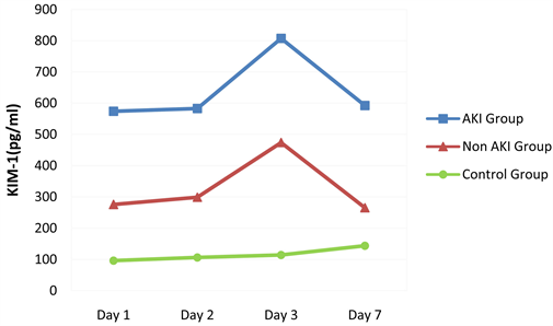Table 4 and Figure 3 show that KIM-1 is significantly high in AKI group and Non-AKI group when compared to control group of the preterm child of same age. This difference is statistically significant. AKI group and non-AKI group, on days 1 to 7, P < 0.05 difference was statistically significant. AKI group and the normal control group, at day 1, 2, 3, 7 days, P < 0.05 and the difference was statistically significant. Non-AKI group and normal control group, was born the first 1, 2, 3, 7 days, P > 0.05 difference was statistically not significant.
