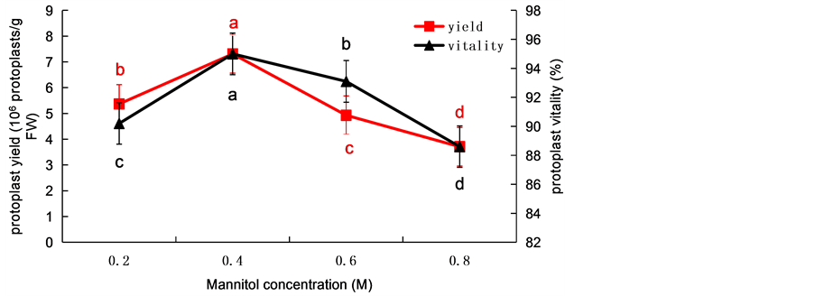 Figure 2. The effects of mannitol concentration on wheat protoplasts yield and viability. Values represent means ± SD (n = 3). The different letters indicate significant differences (P ≤ 0.05) according to the LSD test. FW: fresh weight.