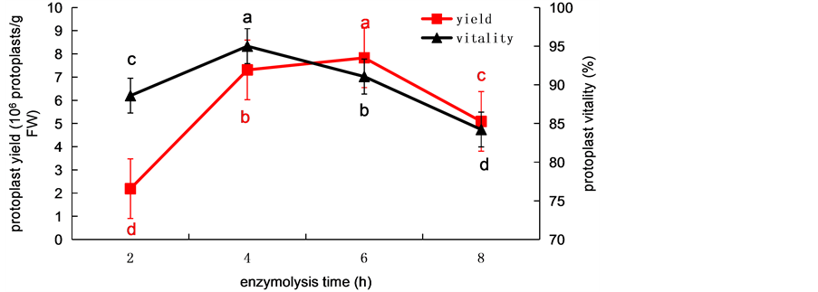 Figure 3. The effects of enzymolysis time on protoplast yield and protoplast viability from wheat. Values represent mean ± SD (n = 3). The different letters indicate significant differences (P ≤ 0.05) according to the LSD test.