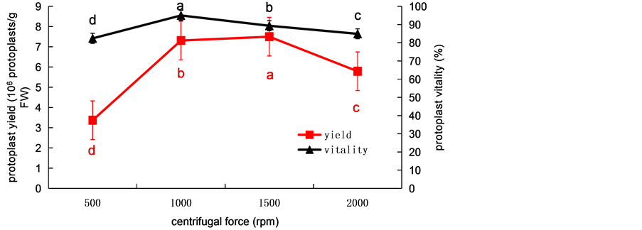 Figure 4. The effects of centrifugal force on protoplast yield and protoplast viability from wheat. Values represent mean ± SD (n = 3). The different letters indicate significant differences (P ≤ 0.05) according to the LSD test.