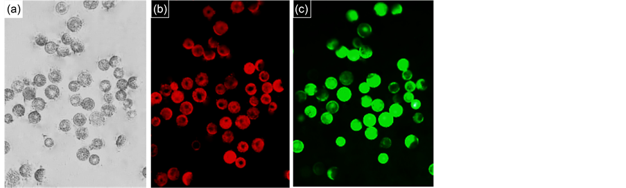 Figure 5. The isolated wheat protoplasts. (a) Bright field images of wheat protoplasts; (b) Autofl uorescence of chloroplasts; (c) Green fluorescence of viable protoplasts after FDA staining (Scale bar = 50 μm, with 40× objective) The protoplasts were isolated from the young leaves of wheat when mannitol concentration was 0.4 M, enzymolysis time was 4h and centrifugal force was 1000 rpm.