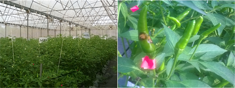 Figure 3. Photographs of chili plants in greenhouse (a) and symptom of anthracnose disease on chili fruit caused by C. gloeosporioides fungus (b).
