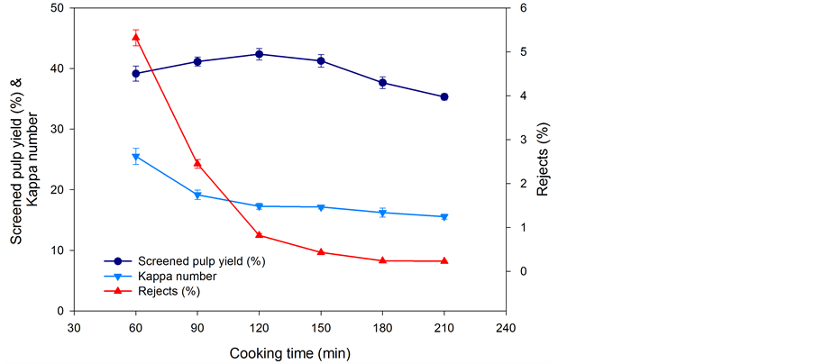 Figure 4. Effect of cooking time on screened pulp yield and kappa number [pulping conditions: Time from ambient temperature to 105˚C = 45 min, time from 105˚C to 130˚C = 35 min, time at 130˚C = varied (60 - 210 min), bath ratio = 1:5, temperature = 130˚C, alkali dose = 12%, as Na2O].