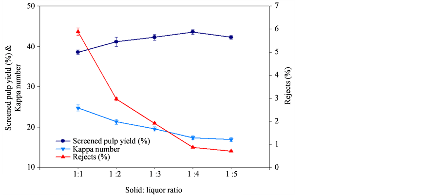 declined sharply up to 12% of active alkali charge and became almost constant thereafter. 12% of active alkali was found optimum for the delignification of E. binata. Active alkali is one of the major factors which affect the degree of delignification and breaking down of carbohydrates significantly in the process of soda pulping. Another set of experiments showed that E. binata produced screened pulp yield of kappa number and screening rejects by 36.76%, 23.23% and 6.34% respectively at a pulping temperature of 120˚C. Further, increase in temperature from 120˚C to 130˚C, screening rejects reduced to 0.9% and screened pulp yield improved to 41.12% (Figure 3). Beyond a cooking temperature of 130˚C, screened pulp yield decreased while delignification increased slightly. The temperature of 130˚C was found optimum to produce maximum pulp yield with acceptable kappa number. The dissolution of lignin and cellulose was accelerated by increasing the pulping temperature [35] . Figure 4 shows the effect of cooking time on delignification of E. binata during soda pulping, while keeping other variables constant. The maximum screened pulp yield (42.36%) with kappa number (17.27) was obtained at cooking time of 120 min and further increase in cooking time decreased the screened pulp yield significantly while change in kappa number was insignificant. Therefore, an optimum cooking time for soda pulping of E. binata was 120 min. The increase in solid to liquor ratio 1:1 to 1:4 at optimum pulping conditions improved the screened pulp yield from 38.57% to 43.58% while kappa number dropped from 24.74 to 17.38 units. Further increase in solid to liquor ratio adversely affected the screened pulp yield (Figure 5). Finally, it was concluded that maximum pulp yield (43.58%) of kappa number 17.38 with 0.9% screening rejects was obtained at 12% of active alkali (as Na2O) pulping temperature 130˚C, cooking time 120 min and solid to liquor ratio 1:4. Kaur et al. [9] studied the soda pulping of sofia and lemon grass, reported a maximum pulp yield of 43.5% during soda pulping of Sofia grass with 14% active alkali (as Na2O) at pulping temperature 160˚C and pulping time 90 min. Likewise, a maximum pulp yield of 41.4% was obtained during soda pulping of lemon grass at the similar conditions except temperature (150˚C).