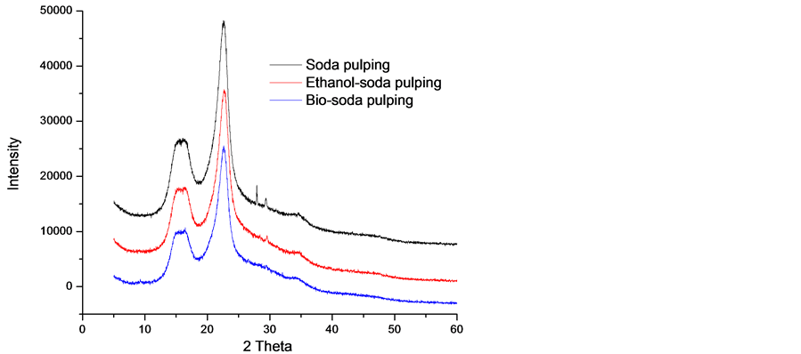 XRD analysis was carried out to determine the crystallinities of soda, ethanol-soda and bio-soda pulps by a Ultima IV Rigaku X-Ray Diffractometer using Cu Kα radiation (λ = 1.5405 Å) at 40 kV and 40 mA. Samples were scanned at angle 2θ ranging from 5˚ to 60˚ with a speed of 2˚/min−1 and a step size of 0.02˚. Crystallinity index was calculated as a ratio between the area of the crystalline contribution and total area by using XRD amorphous subtraction method [25] .