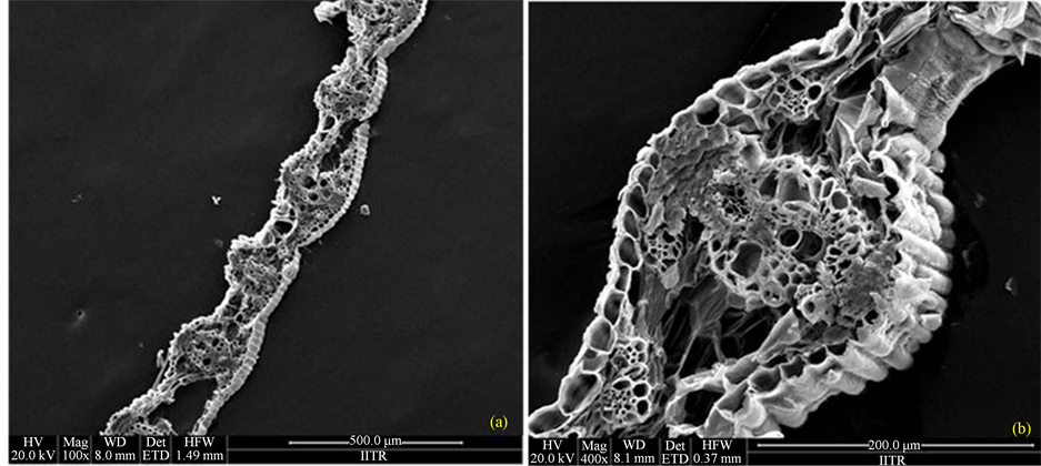 Figure 1. SEM images of transverse section of Eulaliopsis binata, (a) at 100 magnification, (b) at 500 magnification.