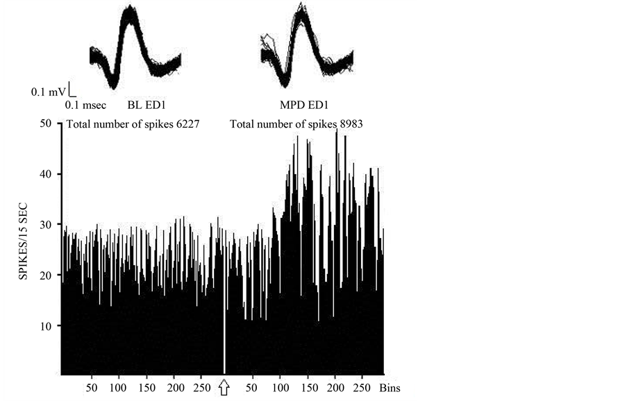 The above mentioned studies regarding neuroplasticity resulting from repetitive MPD exposure can explain our neuronal observation, electrodes recording from PFC units with D1 DA receptors and their neutropil was increased [55] [56] following chronic MPD exposure will respond to chronic MPD by further increasing their firing rate as compared to the initial response, while electrodes recording from neurons with D2 DA receptors that the chronic MPD exposure resulted in a decrease its neuropil will exhibit a decrease in firing rates to rechallenge MPD exposure compared to the initial response, respectively.
