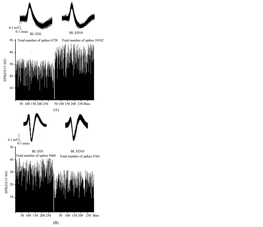 Figure 4. Representative sequential histogram of two PFC units comparing the baseline (BL) activity at ED10 (BL ED10) after six daily 0.6 mg/kg MPD and three washout days with the baseline activity obtained at ED1 (BL ED1). Above each histogram are superimposed 50 spikes aiming to show that the spike amplitude and pattern activity analyzing at ED1 was the same at ED10. The numbers under the spike shapes are the total number of spikes/60 minutes. In A are PFC units that exhibit increases in ED10 BL compared to ED1 BL. In B are the PFC units that exhibit decreases in ED10 BL compared to ED1 BL.