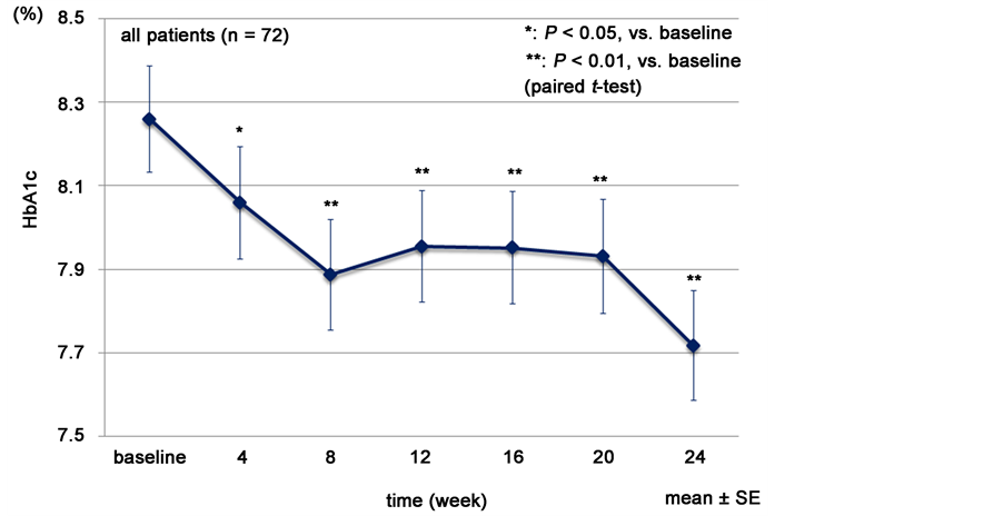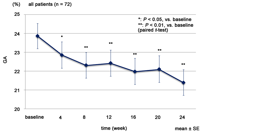 Changes in HbA1c and GA levels are shown in Figure 1 and Figure 2. The mean HbA1c level significantly decreased from 8.26% ± 0.13% before the switch to 7.71% ± 0.13% (P < 0.01) after 24 weeks. Significant decrease in the HbA1c level was seen in both type 1 and type 2 diabetic patients with levels that decreased from