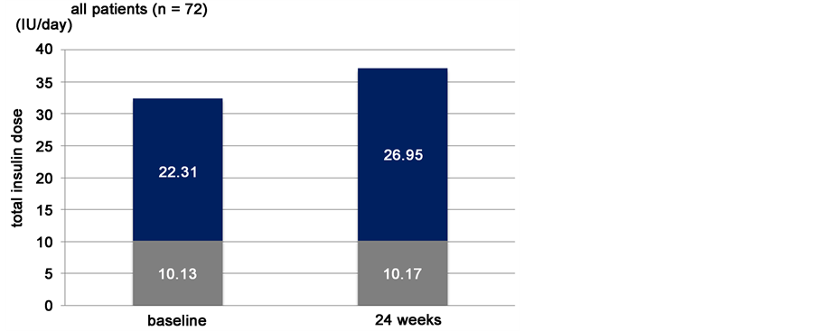 Changes in insulin dose are shown in Figure 3. In all patients, the bolus insulin dose significantly increased from 22.3 ± 1.2 unit/day of Lis before switching to 26.8 ± 1.2 unit/day of Glu after 24 weeks (P < 0.001). The dose of Gla as basal insulin increased significantly from 10.1 ± 1.00 unit/day to 10.6 ± 1.00 unit/day after 24 weeks (P = 0.04).