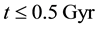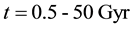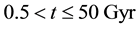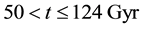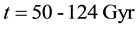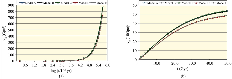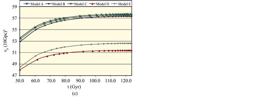 The results illustrated in Figures 1(a)-(c) are supported by those displayed in Figures 2(a)-(c) which show the distributions of the universe horizon volume in the general models in the ranges up to t = 0.5 Gyr, t = 0.5 - 50 Gyr and t = 50 - 124 Gyr respectively. Table 2 presents the universe horizon volumes in the general models at the special times