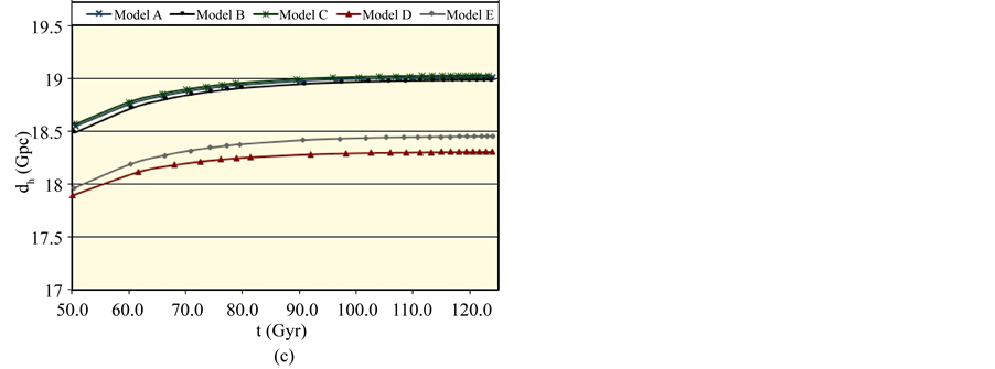 Figure 1. The distribution of the universe horizon distance in the general cosmic models (a) up to t = 0.5 Gyr; (b) in the range t = 0.5 - 50 Gyr; (c) in the range t = 50 - 124 Gyr.