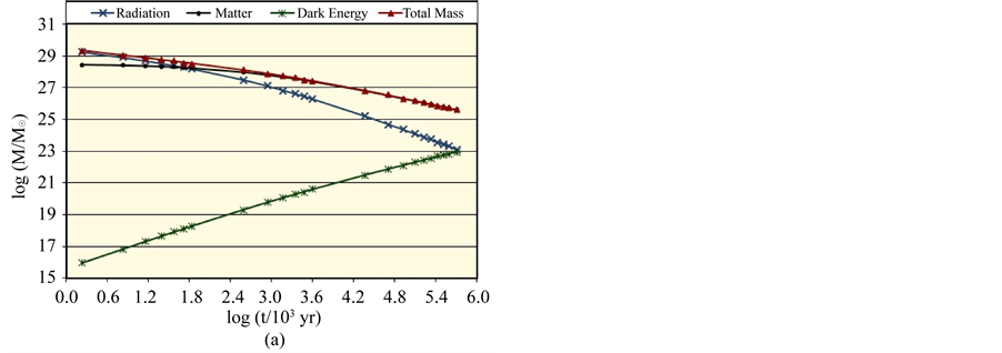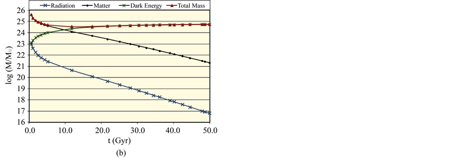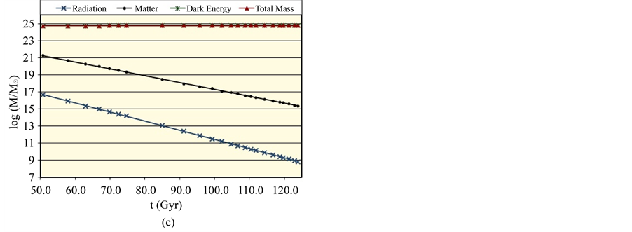 Figure 3. The distribution of mass and energy within the universe horizon volume in any general cosmic model (a) up to t = 0.5 Gyr; (b) in the range t = 0.5 - 50 Gyr; (c) in the range t = 50 - 124 Gyr.