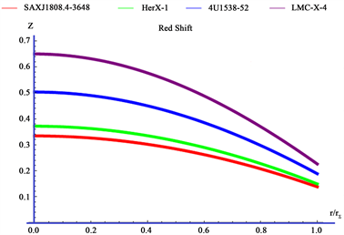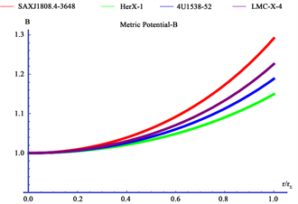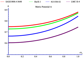For positive value of metric coefficient i.e. is possible if . The monotonically increasing nature of metric coefficients and with increasing radial distance r for suitable choice of constants , and are shown in Figure 1(a) and Figure 1(b). The values of pressure p, density and red shift at the center are given by