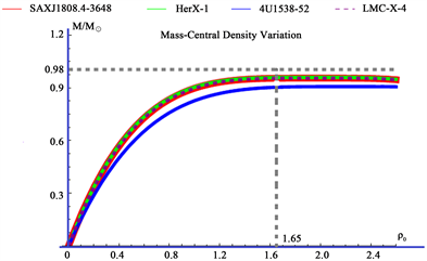 The rate of change of mass of stellar configuration with respect to central density is always positive. Consequently our solution gives stable stellar configuration. The variation of masses of astrophysical objects SAXJ1808.4-3658, HerX-1, 4U1538-52 and LMC-X-4 with their central density is graphically represented in Figure 12.