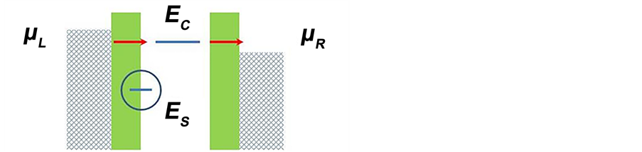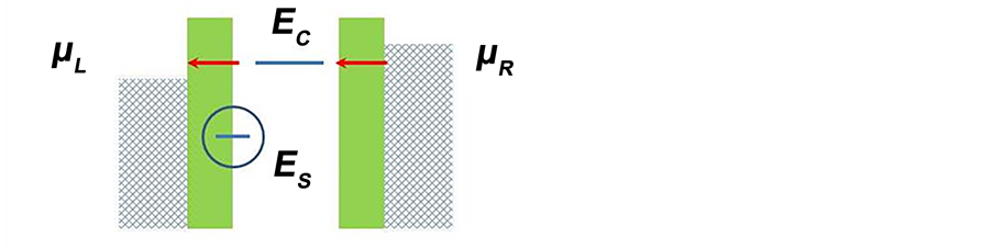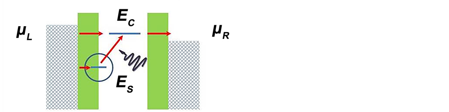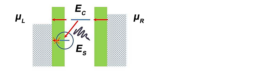 In the case of the light illumination, the electrons from the surface states can be elevated to the conduction band via the photon absorption. It would open the possibility for another transport channel in addition to the direct electron transfer from the left to the right. It is shown in Figure 9(a). After the absorption of aphoton, electrons are promoted to the EC level and can proceed to the right re-
