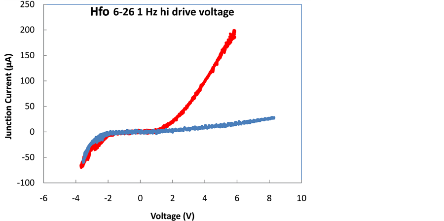 Figure 6. Junction current versus voltage characteristics are shown for a HfO based structure with a sinusoidal swept 0.1 Hz bias voltage with constant 10 Hz on-off strobe illumination. The strobe light only has a measurable effect when the bias voltage is greater than +0.6 V. The data sample rate was 10 kHz.