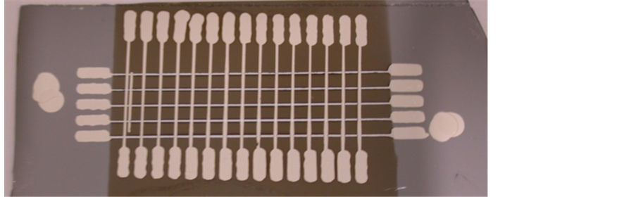 As illustrated in Figure 2, samples with an array of 75 junctions have been deposited onto ≈ 25 mm x ≈ 60 mm silicon device substrates. The junctions have been labeled yj, xi where j can range from 1 to 5, and i from 1 to 15. To ensure that there is a high resistance between the y-stripes it is advisable to use either intrinsic silicon, or silicon that has been over coated with an oxide layer, or an over coat of intrinsic silicon. At the present time we have not been able to achieve uniform junction properties across an entire substrate. This illustrates that junction diode behavior and light response are very sensitive to deposition temperatures and times. For test purposes voltages from about −5 V to +5 V were applied across the junctions in series with a 5 kΩ to100 kΩ current sensing resistor one at a time. Figure 3 shows the light sensitive responses as measured at junction y2, x4 for a simple LED strobe flashlight. The data sampling rate was increased to 10 kHz to better follow the time response. The ratio of the light to dark current was about 48 times at 3 V for a saturating strobe light intensity. The increase in the electrical conductivity is roughly proportional to the illumination intensity up to some saturation value.
