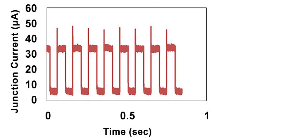 Figure 5 shows the junction current as a function of time for 1 Hz square wave biasing voltage as the junction was illuminated with a white LED strobe light at a steady rate of approximately 10 Hz. It can be seen that there is a response to the strobe light only when the top surface is positive during the square wave bias voltage cycle. The 3 volt square wave bias was applied across the com- bination of the junction y4, x7 in this case in series with a 5 kΩ resistor. The actual junction resistance is always large compared to the 5 kΩ resistor. The ratio of the current during illumination compared to the dark current was approximately a factor of 20. The behavior illustrated here is consistent with that expected from Figure 1.
