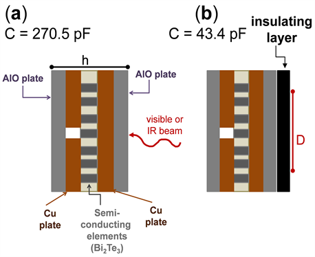 Capacitors. To test the interaction between visible and IR light and matter we used Custom Thermoelectric 07111-9L31-04B devices. These devices produce a voltage difference where there is a temperature difference across the device in agreement with the Seebeck effect , where S is the Seebeck coefficient. However, their multilayer structure consisting of AlO-Cu-Bi2Te3-Cu-AlO shown in Appendix 1 can also be viewed as a capacitive structure. The basic device has a height h = 3 mm and a capacitance C in the pF range. Adding insulating layers to the basic device, and varying the cross-sectional area with diameter D of the illuminating laser, enable us modifying the capacitance C. The configurations of the devices examined in our work, alongside their C and dielectric constant values, are summarized in Appendix 1. The values are calculated from , where is the permittivity in vacuum.