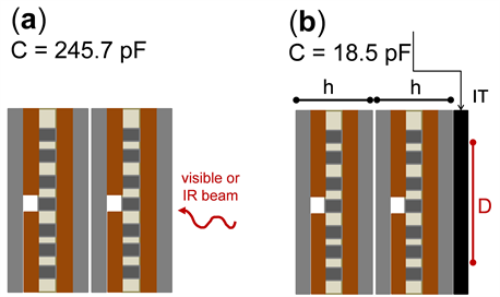 Figure A1. Schematics of (a) a single capacitor, and (b) a single capacitor with additional insulating tape (IT). The IT consists of heavy cotton cloth pressure sensitive tape with strong adhesive and tensile properties. We use the IT to modify the capacitance C of the capacitor. The multy-layer structure consisting of AlO-Cu-Bi2Te3-Cu-AlO is illustrated. The capacitor has a thickness h = 3 mm. The cross-sectional area of the visible or IR laser has diameter D and corresponds to the illuminated area of the capacitor.