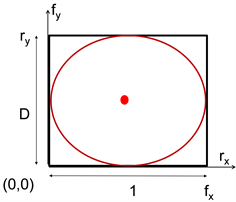 Figure A3. Description of the visible or IR laser’s cross section with diameter D, centered in the thick dot and impinging on the surface of the capacitor. The origin of the reference systems of the spatial coordinates and of the dimensionless fractions coincide. The spatial coordinates and span from 0 to D, while the dimensionless fractions and vary from 0 to 1.