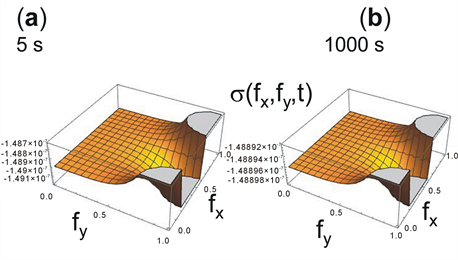 Figure A4. 3D representation of the evolution after 5 s and 1000 s after the beginning of the illumination of the surface charge density according to Equation (A10) and pertinent to the specific case of Figure 1(a) with C = 43.4 pF, and illumination with a continuous wave (c.w.) laser with P = 700 mW, D = 3 mm, and τ = 3.55 fs. The changes of the values on the z-axis for are as follows: after 5 s from to , and after 1000 s from to .