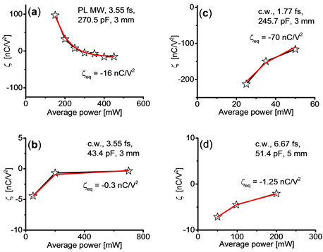 Figure A5. Correction factor versus average power P for the following cases: (a) pulsed laser (PL), τ = 3.55 fs, C = 270.5 pF, D = 3 mm. (b) continuous wave (c.w.) laser, τ = 3.55 fs, C = 43.4 pF, D = 3 mm. (c) c.w., τ = 1.77 fs, C = 245.7 pF, D = 3 mm. (d) c.w., τ = 6.67 fs, C = 51.4 pF, D = 5 mm. Each panel reports the value of the corresponding equilibrium correction factor .