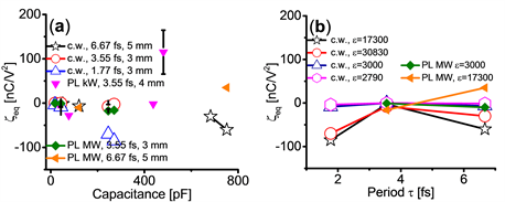 Figure A6. Equilibrium correction factor versus (a) capacitance c and (b) period τ for the cases of continuous wave (c.w.) and pulsed (PL) lasers with various values of cross-sectional diameter D illuminating capacitors with various values of the dielectric constant ε reported in Table A1 and Table A2. The PL lasers we used to obtain the results with τ = 6.67 fs are deascribed in Table A3.