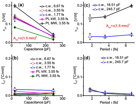 Figure A7. Trends of the (a) voltage and (b) temperature responsivities and corresponding uncertainties versus capacitance C for capacitors illuminated on a cross-sectional area with radius with continuous wave (c.w.) lasers of periods τ = 1.77 fs (λ = 532 nm), 3.55 fs (λ = 1064 nm), and 6.67 fs (λ = 2 × 103 nm). We also display data obtained upon illumination of the same capacitors with pulsed (PL) lasers with τ = 3.55 fs and in the kW and MW ranges. Trends of the (c) and (d) responsivities and corresponding uncertainties versus period τ of the visible and IR lasers. The data were collected with c.w. lasers with periodτ = 1.77 fs, 3.55 fs, and 6.67 fs illuminating a cross-sectional area with radius on capacitors with C = 18.51 pF and C = 245.7 pF. These capacitors are described in Figure A2 and their characteristics are summarized in Table A2.