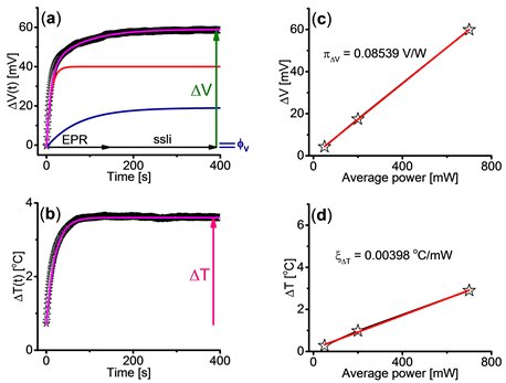 The typical trends of and are displayed in Figure 1(a) and Figure 1(b). Similar trends with current appear in Ref. [7] . We fit the experimental data in Figure 1(a) with a sum of two exponential functions, and those in Figure 1(b) with a single exponential function. From the fitting functions we extract the amplitude of the jumps in voltage and temperature, and respectively, labelled in Figure 1(a) and Figure 1(b). On average, the time constants of and in the EPR are ~10 s and ~35 s, respectively. We then plot and versus the average power P of the visible or IR light, and observe linear trends as those illustrated in Figure 1(c) and Figure 1(d). We measure the slope of versus P in Figure 1(c) to obtain the voltage responsivity [16] , and the slope of versus P in Figure 1(d) to obtain the temperature responsivity . The and responsivities indicate the amount of voltage and temperature produced by the capacitor at a certain average power P of the visible or IR lasers.