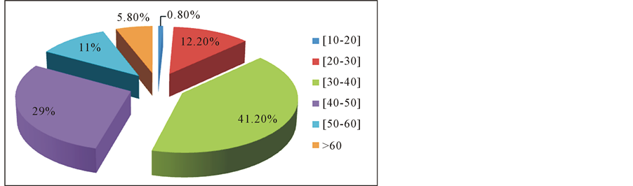 Two hundred and sixty two patients met the criteria. The mean age of the patients was 38.0 ± 7.1 years .The repartition of the patients by group age can be visualized by Figure 1. The mean duration of infertility was 5.3 years (ranges 1 - 5.7). Primary infertility represented more than half of the patients in this sample (57.4%). In the medical history, we found that 113 patients presented in the past a pathology that could be related to infertility. Among them 48 of them were treated for an infection of the genital tract and 46 of them were followed for varicocele. The other patients (n = 149) came for analysis for the first time and the etiology of their infertility was under establishment (Table 1).
