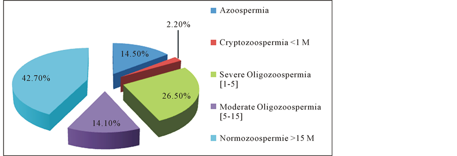 Azoospermia is also very important in our findings with a rate of 14.5%. This is little more than the double, compared to the data in Owolabi study (6.2%) [17] . This can be the result of endocrinal, or genetic disorder but is also a consequence after genital tract infection and varicocele [10] . An abnormality in ejaculation has to be researched, especially in our series where the prevalence of hypospermia is 11.9%. Before concluding definitively to an azoospermia, anejaculation, incomplete ejaculation and retrograde ejaculation have to be identified.