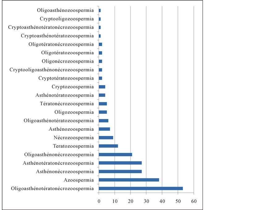 The most common profile of abnormality, in our study is oligo-astheno-terato-necrozoospermia (n = 53), followed by azoospermia (n = 38) then by astheno-necrozoospermia (n = 27) and astheno-terato-necrozoospermia