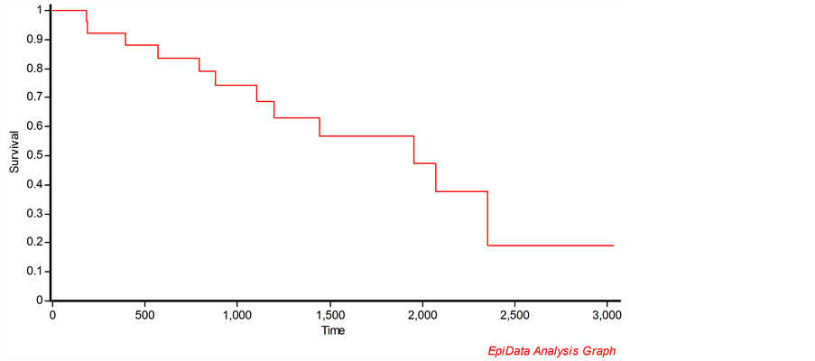 Of the 580 patients whose samples were tested at the laboratory 31 (5.3%) patients were tested positive for drug resistant TB and were initiated on treatment. All the patients had history of previous anti-TB treatment. The median time from being known as HIV positive to being diagnosed as DR-TB was 1168 days (IQR: 571 - 1955) (Table 2). The median age for males and females who developed the DR-TB was 35 years and 29.5 years respectively. The median base line CD4 count was 215 cells/mm3 (IQR: 155-351). Majority of them were initiated on tenofovir based regimen. Low CD4 count (<200 cells/mm3) was significantly associated with early incidence of DR-TB (Table 3). Nearly 55% and 36% of patients had culture conversion at the end of 6 months and 12 months treatment. At the end of 14 months, nearly 39% of patients had died and 49% of patients were on treatment. Figure 1 shows the survival probabilities of HIV/DR-TB patients in days.