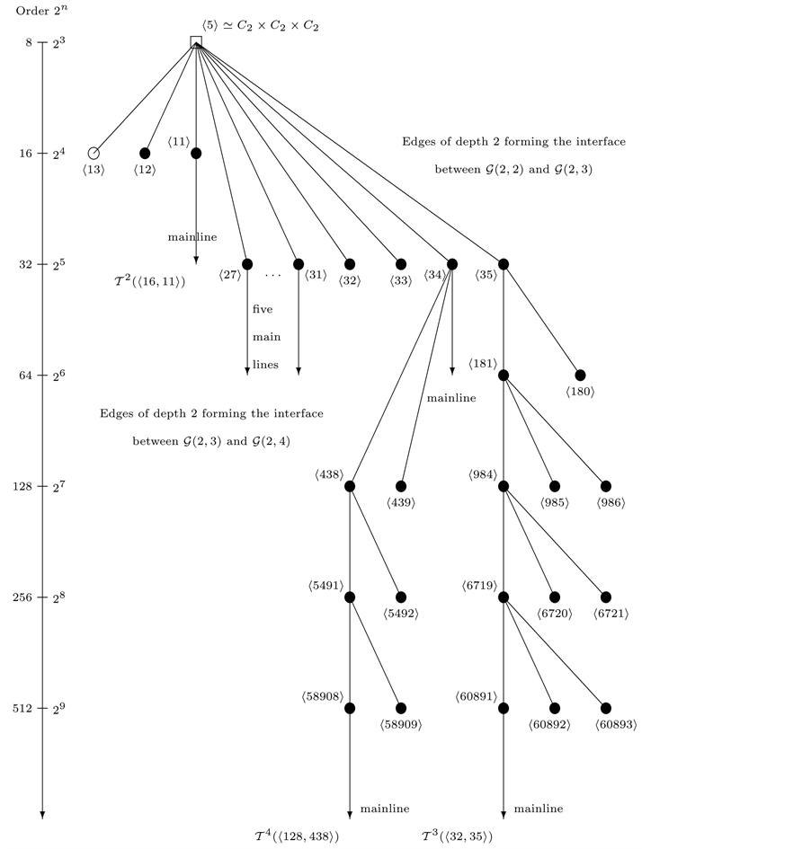 in the following concrete examples of descendant trees, are due to Besche, Eick and O’Brien [16] [17] . When the group orders are given in a scale on the left hand side as in Figure 2 and Figure 3, the identifiers are briefly denoted by