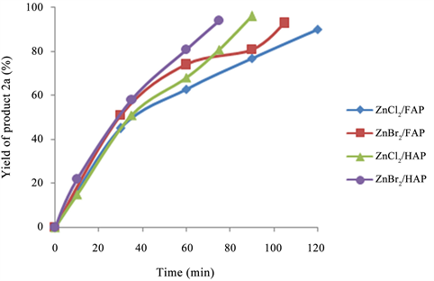 To evaluate the influence of the metal halide in the activity of the doped material, we have compared the yields obtained in the synthesis of product 2a using ZnCl2/HAP, ZnBr2/HAP, ZnCl2/FAP and ZnBr2/FAP. Thus the kinetic curves of these reactions as shown in Figure 1, indicate clearly the promoting effect of Lewis acids, ZnBr2/HAP appear to be somewhat the more active catalyst. Reuse of ZnBr2/HAP was studied in the synthesis of product 2a. The yields obtained were 94%, 76% and 69% using the fresh catalyst and reused for the first and the second time, respectively. The decrease of the yields can be explained by the accumulation of organic substrates over the active sites of the catalyst.