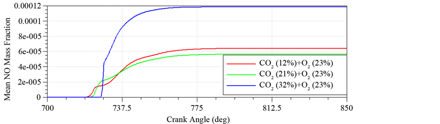 ponding increase. The conditions of to produce NO in high temperature and oxygen enrichment are conducive to NO. When the oxygen content is 26%, NO significantly rise. If continuing to add content of oxygen, it will produce a lot of NO and this is not conducive to reduce NO in exhaust pipe. The Figure 5 shows that in the condition of rich oxygen (23% O2), when the amount of CO2 [6] is not much, mean NO mass fraction will decrease with the increase of CO2. This is due to the high specific heat of CO2 can reduce temperature of combustion chamber and prevent increase of NO. However, when the amount of CO2 is very much, NO will sharp rise.