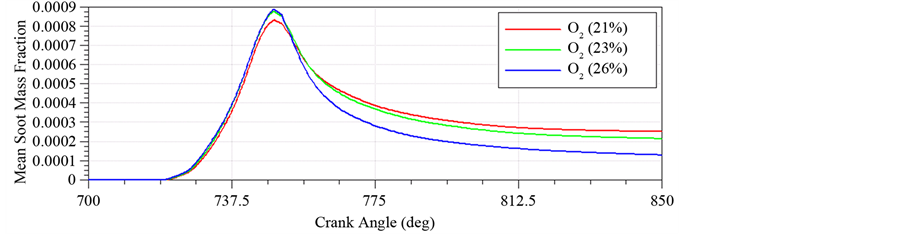 The Figure 7 shows, without additional CO2, the amount of Soot will decline when oxygen content increase. Because of additional O2 can help to burn, the emissions of particulate matter will be reduced. The Figure 8 shows when O2 is rich, adding a little CO2 to combustion chamber, the output of Soot only change a little [8] . However, if add a mass of CO2 to combustion chamber, the output of Soot will greatly reduce. The Figure 9 shows that under the same CO2, increasing O2 will help reduce Soot. Therefore, oxygen-enriched combustion can reduce soot. In addition to, if CO2 instead of N2, when CO2 reaches a certain value, it also will reduce the emissions of soot.