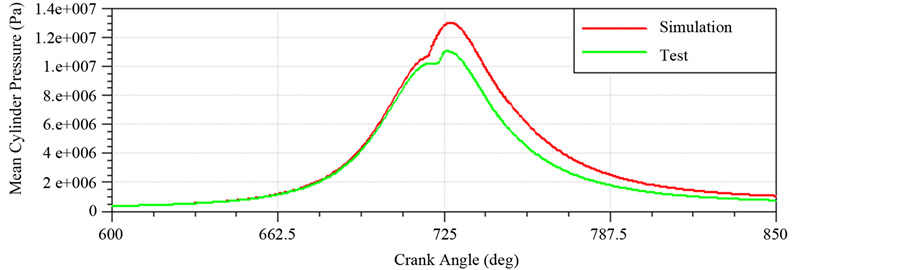 With the model diesel engine (2000 r/min and full load), the comparison of the pressure’s values of cylinder measured by numerical simulation and experimental testing was shown in Figure 3. The diagram shows that the trend of cylinder pressure by numerical simulation and actual measurement almost is same. Meanwhile, the result of numerical simulation also is different from engine bench test. There exists difference mainly in this paper, the cause of geometric model is established based on combustion chamber and turbulence intensity at the end of inlet is obtained by empirical formula. Also some boundary conditions are obtained by empirical estimates, such as initial temperature of cylinder head, initial temperature of cylinder wall and initial temperature of piston. And fuel injection laws of numerical simulation and actuality exist certain differences. But in general, the selection of numerical model is reasonable.
