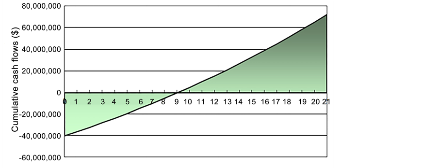 Figure 9. Cumulative cash flows in a 5 MW solar PV plant in Sabah (Malaysian Ringgit RM).