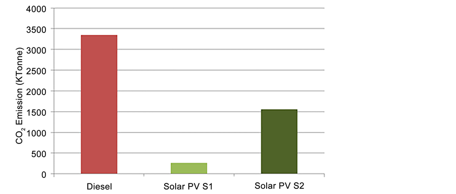 plants with large scale solar PV emission mitigation can be achieved. As shown in Figure 10, in Scenario 1 where one solar PV plant with capacity of 5 MW electricity generation, annually this can reduce the CO2 emission from the diesel plant for 260 kT CO2. On the other hand in Scenario 2 where all the electricity generation from diesel power plants in another 10 years be replaced by Solar PV plants, the amount of CO2 emission avoided is 1.55 GT CO2.