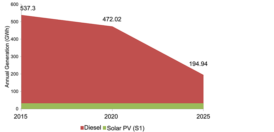 Scenario 2 (S2): proposed 5MW solar PV plants to cover for 2025 electricity production from diesel.